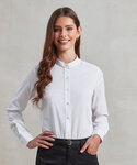 Classic banded ‘Grandad’ collar with top button fastening. Double-button cuff and sleeve guard. Bust, back darts and a curved hem. Pearlised buttons.