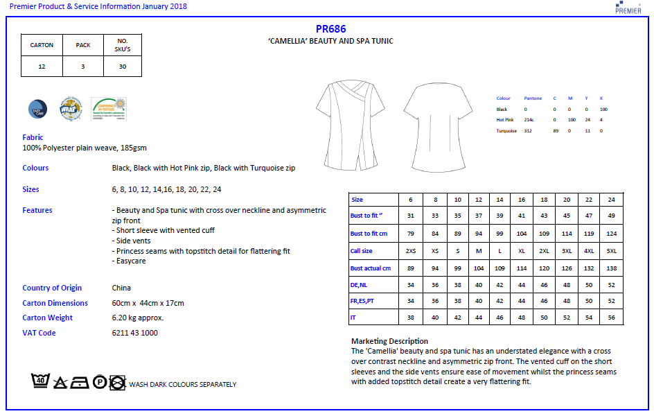 The Camellia Beauty and Spa tunic from quality workwear brand Premier. Smart and modern styling with cross over neckline and asymmetric zip front.