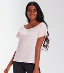 Loose fit. Raglan sleeves. Wide off the shoulder neckline. Raw edge neckline and sleeves. Side vents. Drop tail.